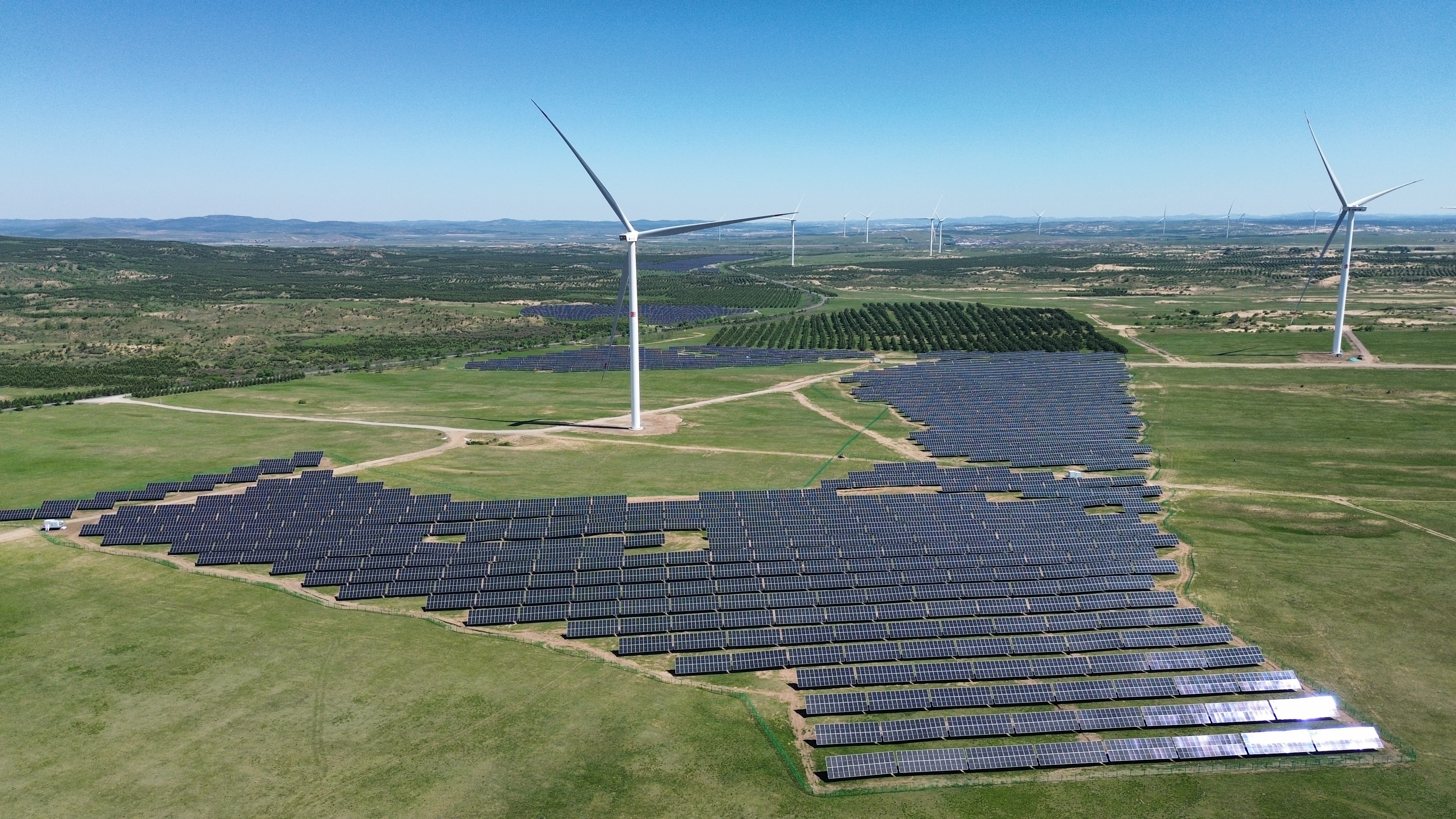新能源分公司先后建成風電及光伏項目224個,總容量11948MW,其中建成光伏項目33個,容量1566MW;建成風機機組4152臺。在建新能源項目25個,其中EPC風電項目2個,容量100MW,EPC光伏項目7個,容量457MW。送變電工程公司在建光伏項目4個,容量420MW;在建風電項目2個,容量74.5MW,風機機組22臺。